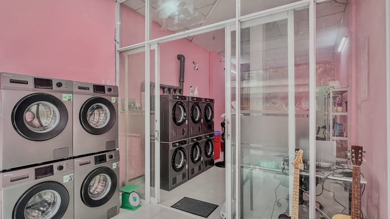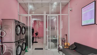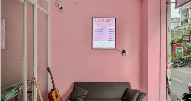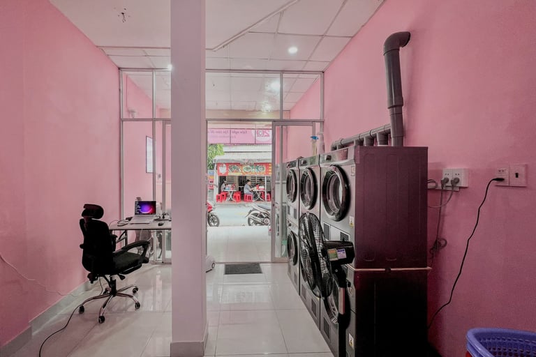 Mang đến dịch vụ giặt sấy tiện lợi, giao nhận tận nơi với phong cách trẻ trung, màu hồng đặc trưng.